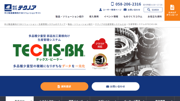 ここでは部品製造から金属加工まで幅広い業種に対応可能な生産管理システム「TECHS-BK」(テクノア)の導入効果や特徴を紹介しています。
